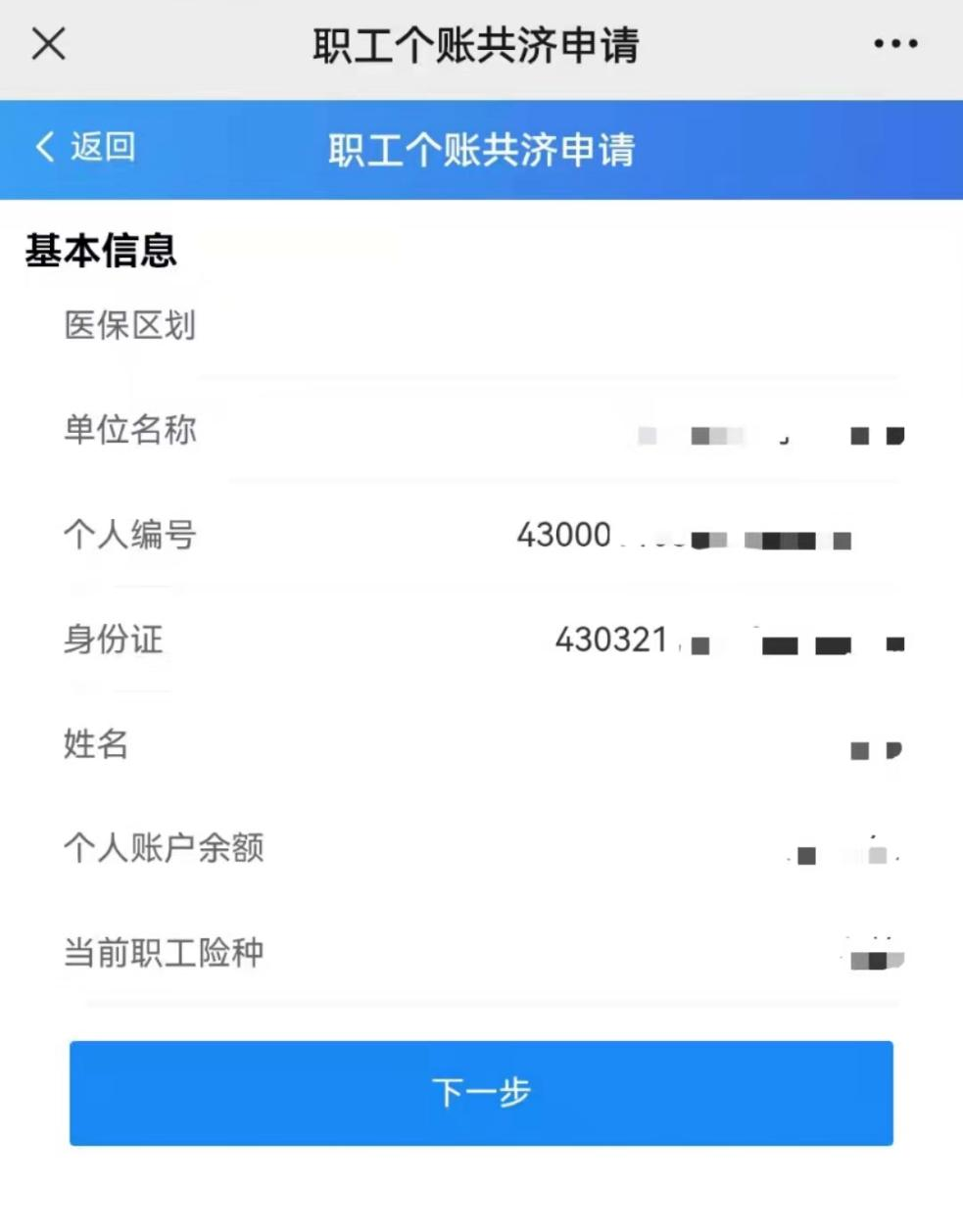 第二步:確認(rèn)參保信息,在個人賬戶有余額且參保狀態(tài)正常的情況下,點擊下一步。
